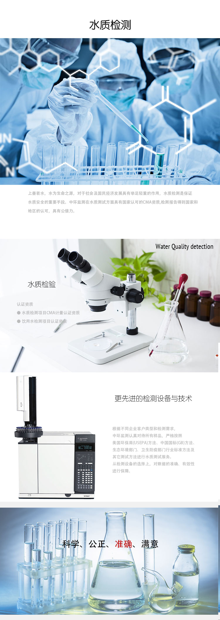 根據(jù)不同企業(yè)客戶類型和檢測需求,中環(huán)監(jiān)測認真對待所有樣品,嚴(yán)格按照美國環(huán)保局(USEPA)方法、中國國標(biāo)(GB)方法、生態(tài)環(huán)境部門、衛(wèi)生防疫部門行業(yè)標(biāo)準(zhǔn)方法及其它測試方法進行水質(zhì)測試服務(wù)。如果您有關(guān)于水質(zhì)方面的檢測需求,歡迎與我們聯(lián)系。